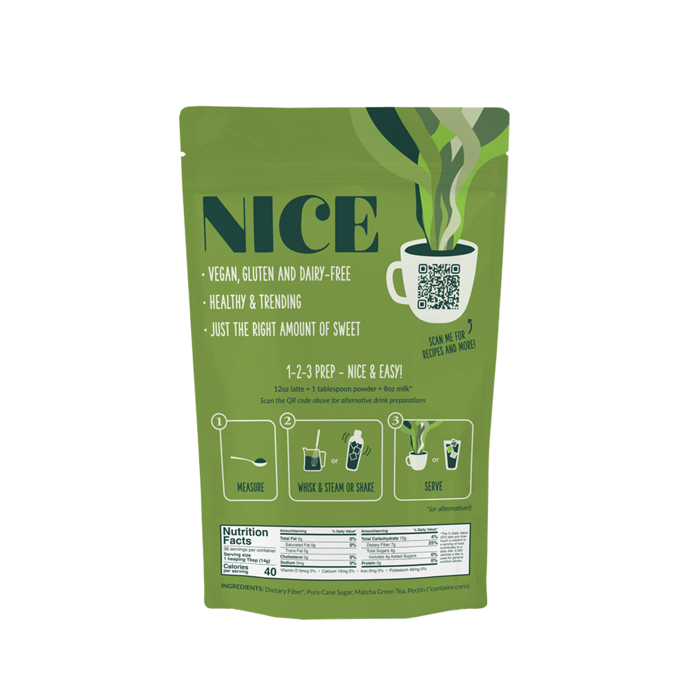 Finely ground green tea, called Matcha, has been consumed in Japan for centuries, and is becoming a regular addition to tea culture around the world. Our Nice Matcha was specifically created with delicious matcha beverages in mind: It is less sweet than other matcha latte mixes, and dairy-free so you can use a milk alternative with ease. Lattes prepared with Nice Matcha are creamy, rich, satisfying and not too sweet so you can always add your own sweetener.